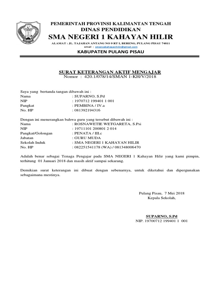 Surat aktif mengajar adalah surat yang dikeluarkan oleh instansi pendidikan (contohnya sekolah) untuk menyatakan bahwa seorang guru masih aktif mengajar di instansi tersebut dengan mengampu mata pelajaran tertentu. Admin blog contoh seputar surat 2019 juga mengumpulkan gambar gambar lainnya terkait contoh surat keterangan aktif mengajar guru honorer dibawah ini. Pada postingan kali ini saya akan memberikan 2 jenis contoh surat keterangan bersedia melepas guru yang akan pindah tugas mengajar dari kepala sekolah. Desember dari kepala sekolah yang telah dilegalisir oleh kepala sekolah. Juni dan 2020/2021 untuk juli s.d. Surat pernyataan kepala sekolah guru mengajar di sekolah induk. Jika guru dan tenaga kependidikan tidak terdaftar, maka bisa menyertakan surat pernyataan dari kepsek dan bawa surat ke lokasi vaksinasi, ungkap nadiem di jakarta, rabu (24/2/2021). Contoh surat penugasan dari kepala sekolah / kepala dinas yang menyatakan masih aktif adalah sebuah format surat yang menjadi salah satu persyaratan pppk / p3k tahun 2019. Cara mendapatkannya cukup mudah, yaitu dengan menemui kepala sekolah dan menjelaskan maksud pembuatannya. Guna meme nuhi kekurangan jam wajib mengajar 24 jam per. Pernyataan tertulis dari kepala sekolah ini bisa untuk guru ataupun siswa, tentunya untuk suatu keperluan dari objek yang dinyatakan. Ketika anda mengunduh format surat pernyataan kepala sekolah untuk di upload pada sispena yang telah disediakan oleh sispena namun tidak bisa dibuka secara normal. Digunakan sebagai bukti bahwa seorang guru atau kepala sekolah aktif melaksanakan tugas mengajar di sebuah instansi sekolah atau.